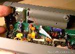 Отвинтите маленькие винты, крепящие плату изнутри к задней крышке корпуса. Начните поднимать плату, начиная с левой стороны (где размещены разъемы антенны, наушников и сетевого адаптера).